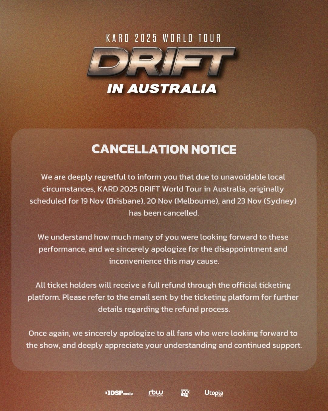 We are deeply regretful to inform you that due to unavoidable local circumstances, KARD 2025 DRIFT World Tour in Australia, originally scheduled for 19 Nov (Brisbane), 20 Nov (Melbourne), and 23 Nov (Sydney) has been cancelled.