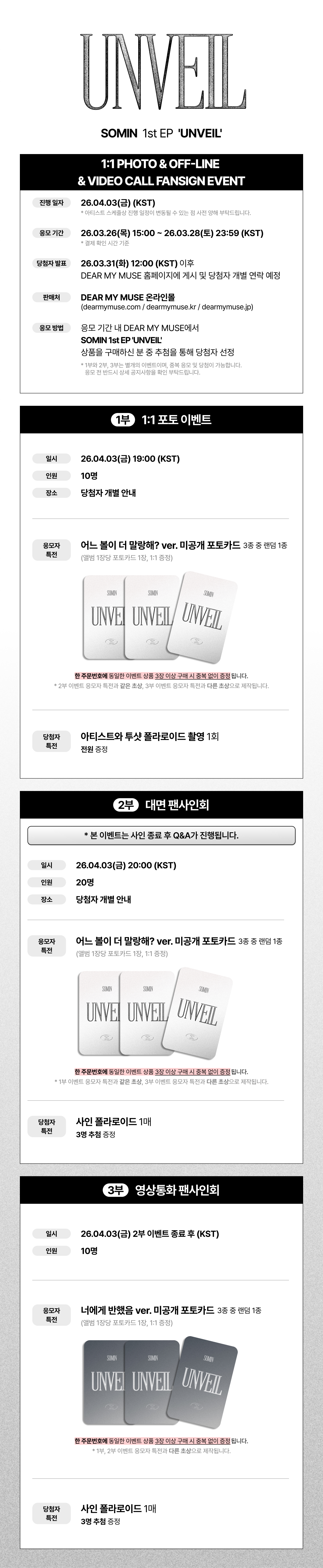 SOMIN 1st EP ‘UNVEIL’ 발매 기념 1:1 포토, 대면 및 영상 통화 팬사인회 이벤트 안내 (DEAR MY MUSE)